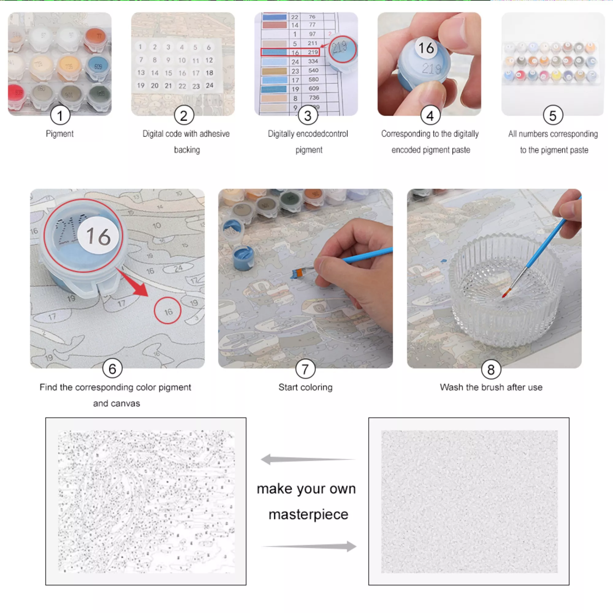 - You only need to fill the numbers on the canvas with paint, even if you don't have basic knowledge of painting, you can draw beautiful pictures. Start your DIY journey with our acrylic paint set and enjoy the fun of coloring.