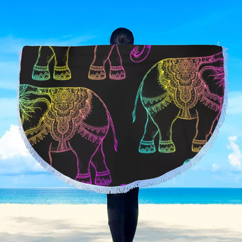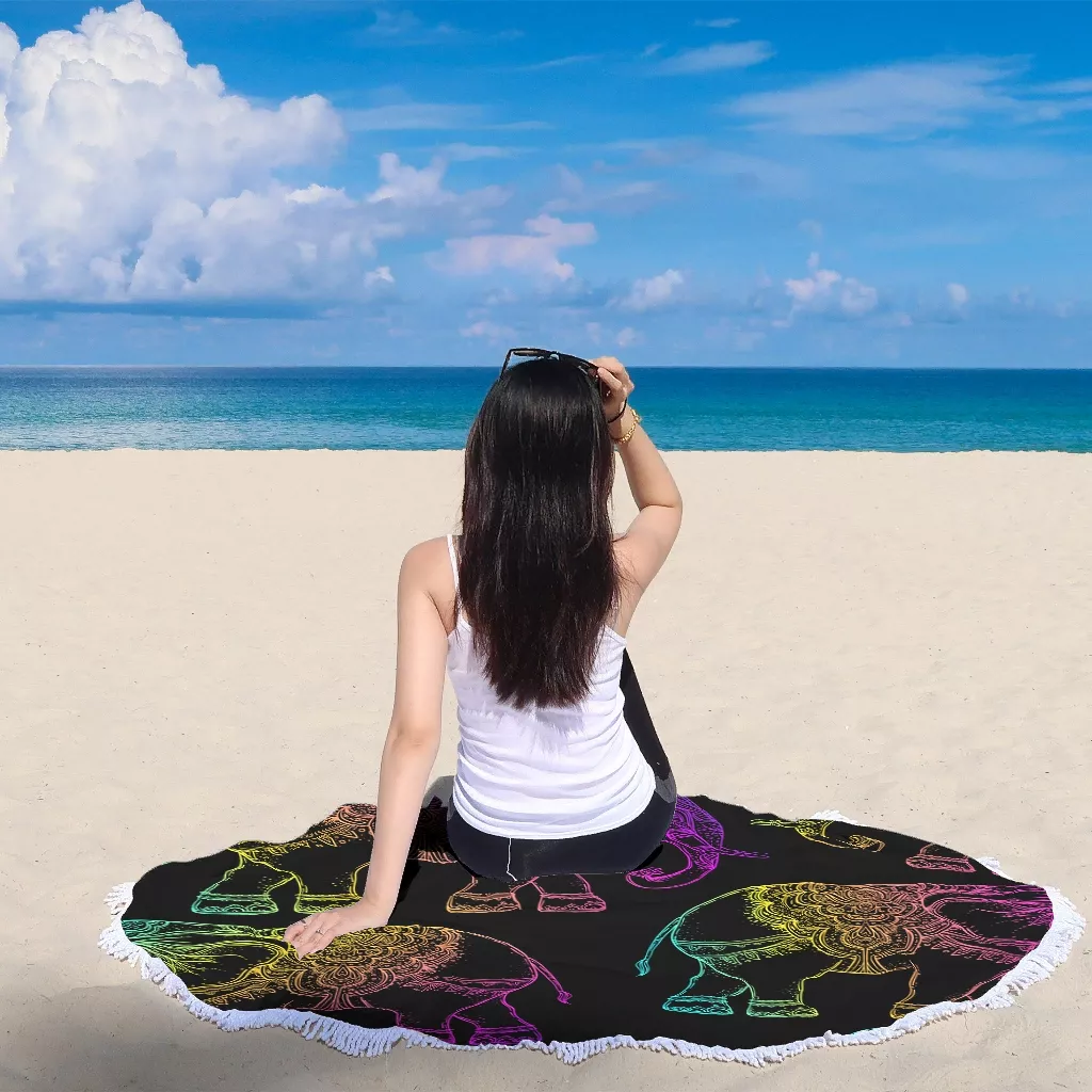 Rainbow Yoga Elephant Indian Round Beach Towel Blanket Throw With Tassel Microfiber Yoga Mat