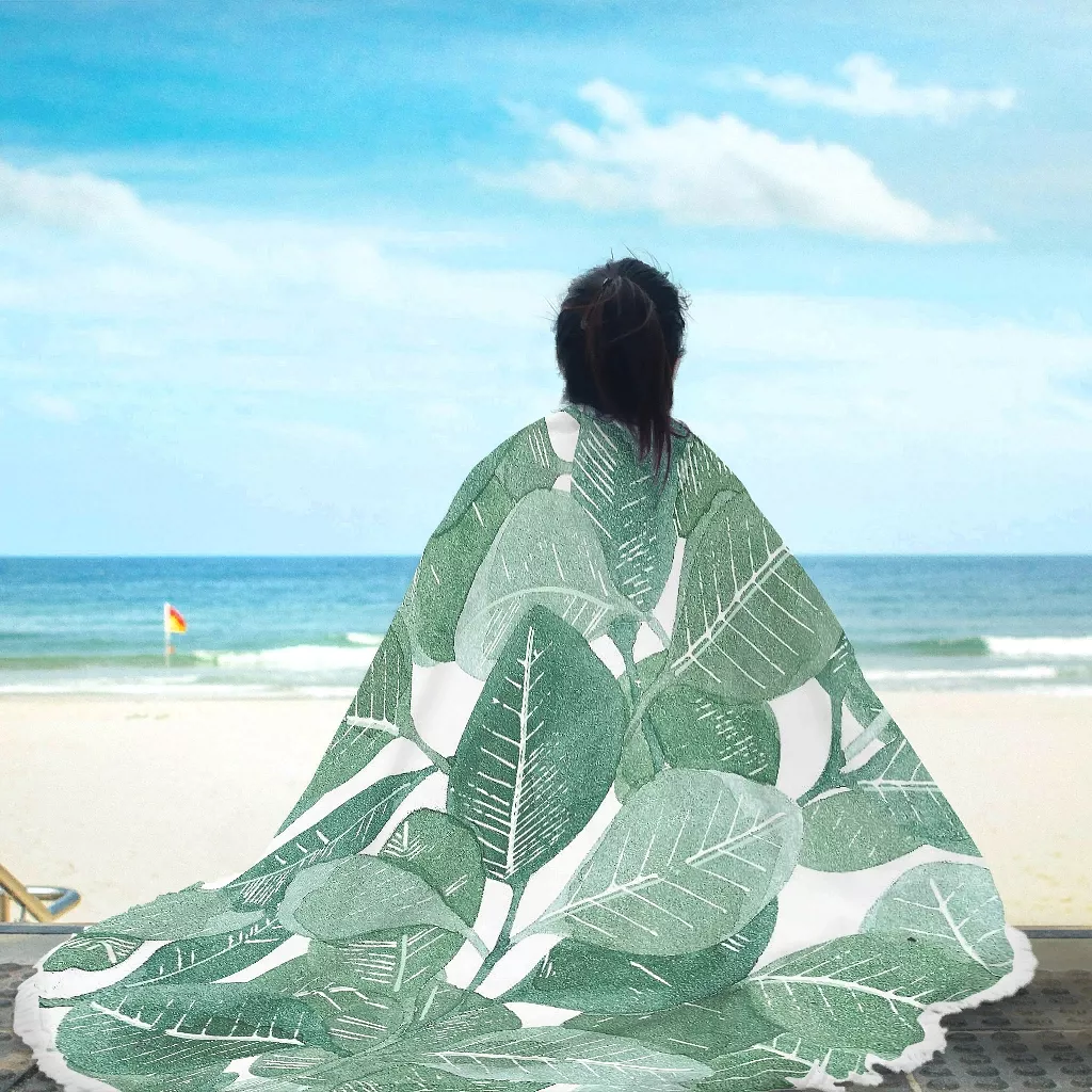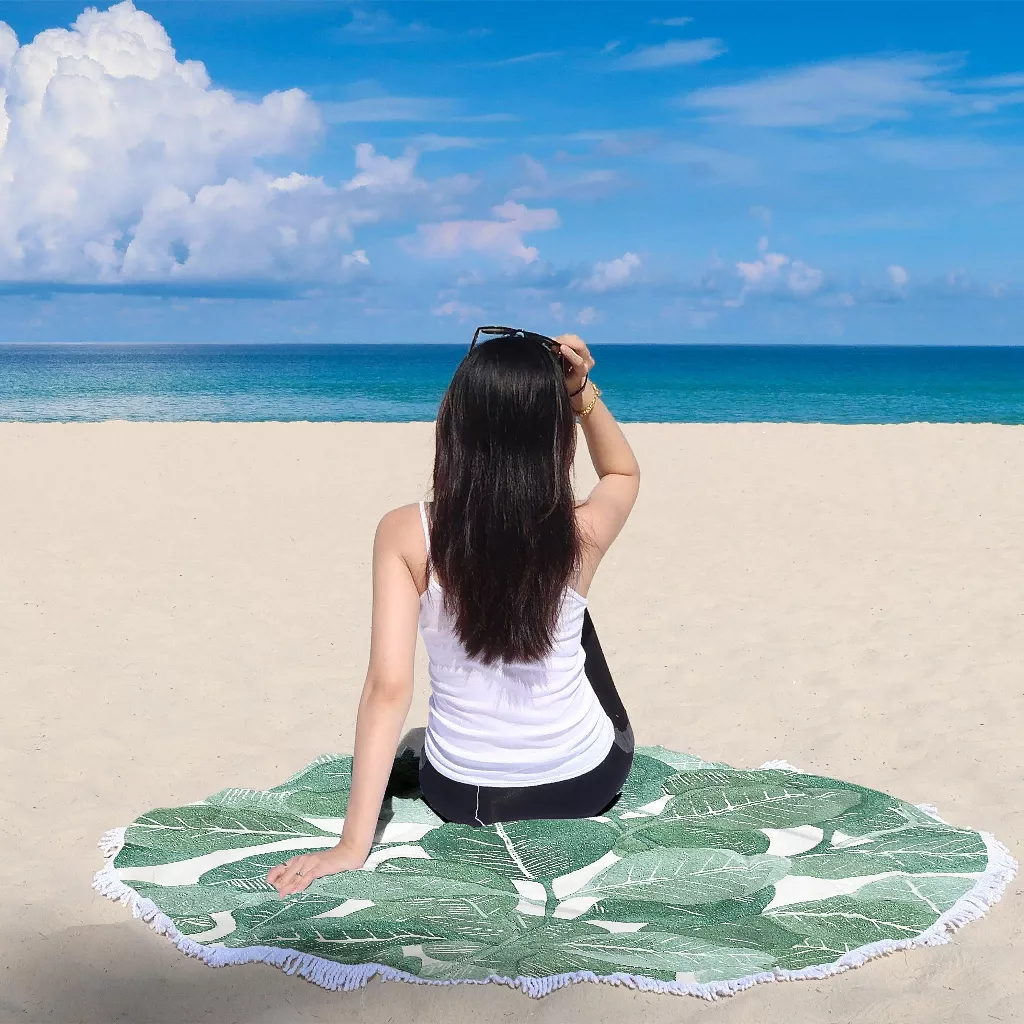 Large Microfiber Terry Round Beach Towel Summer Green Plant Leaf Beach Towel Yoga Mat Blanket
