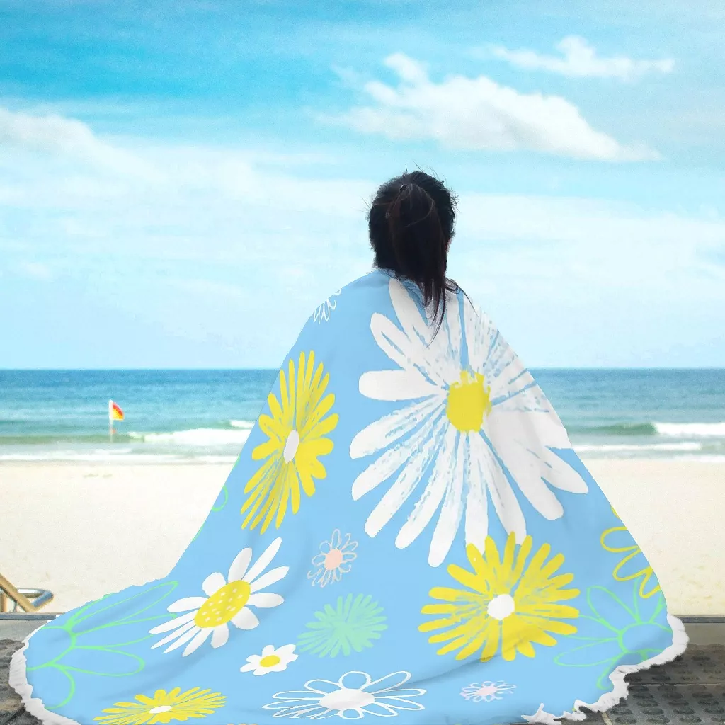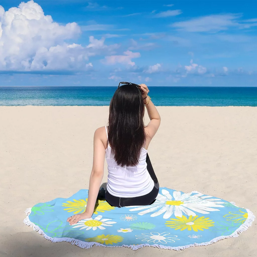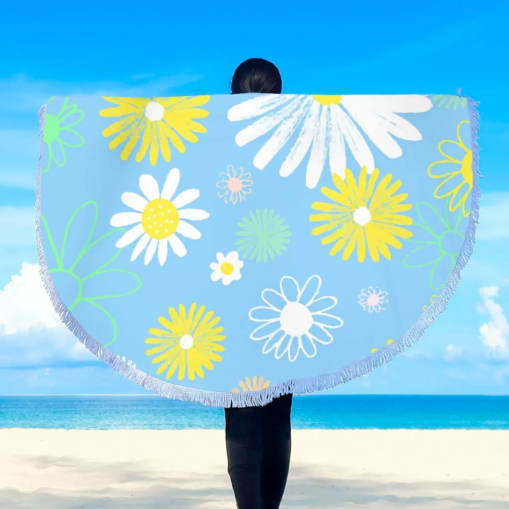 Summer White Yellow Flowers Daisy Round Beach Towel Sunflower Blue Large Circular Yoga Mat